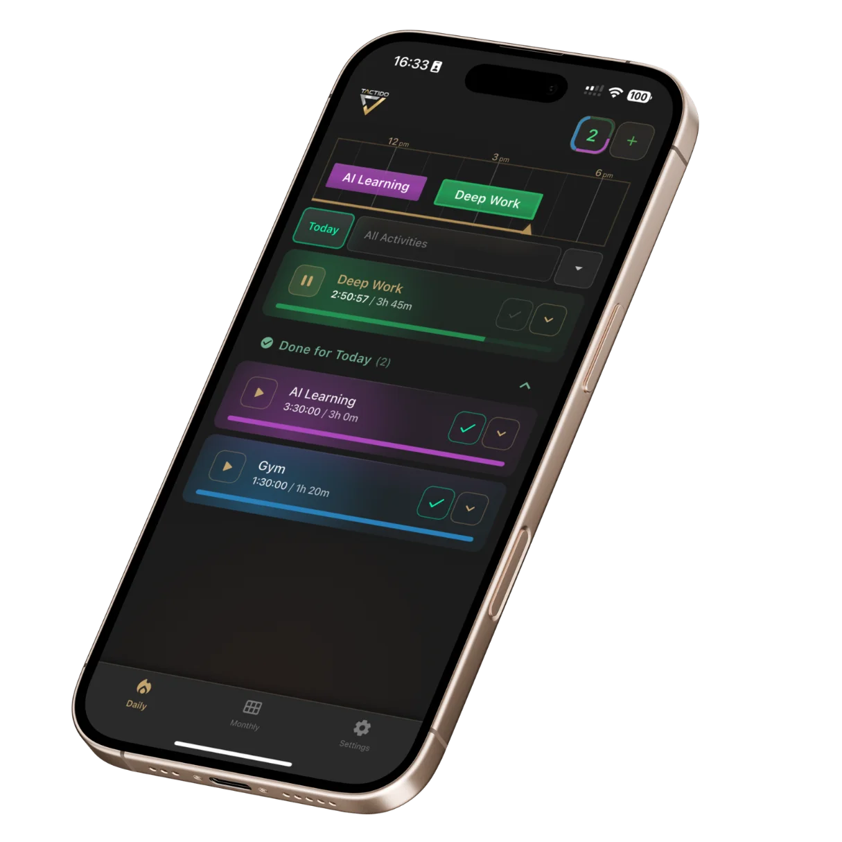 Od głębokiej pracy po projekty osobiste i treningi — wszystko jest wyraźnie śledzone i zostaje połączone z kontekstem.